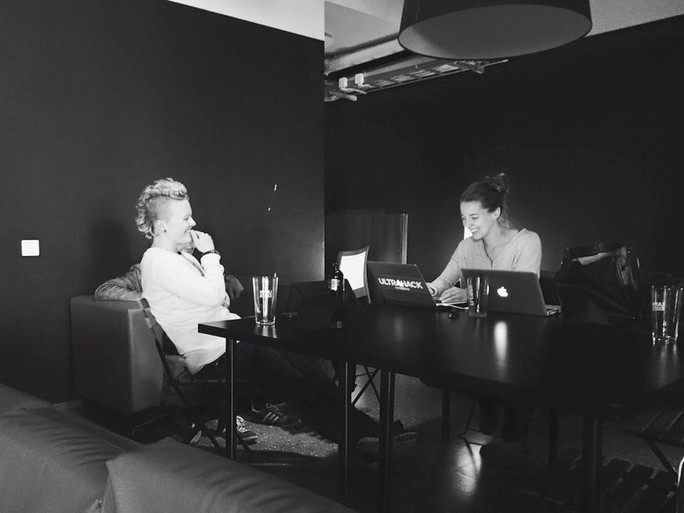 Pelikonsepteja lapsipotilaille uuteen Lastensairaalaan suunnittelemassa jalkaterapian opiskelija Katju Lähteenaro ja kulttuurituotannon opiskelija Tara Nyman. Kuva: Sonja Linkoneva. Pelit esiteltiin Slush Ultrahack –tapahtumassa.