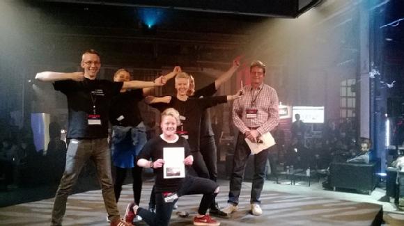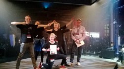 Slush Ultrahack-tapahtuman voittajajoukkue ylpeänä. Palkinnon jakoi ylilääkäri Pekka Lahdenne, Uusi Lastensairaala 2017. Kuva Kati Forsman.