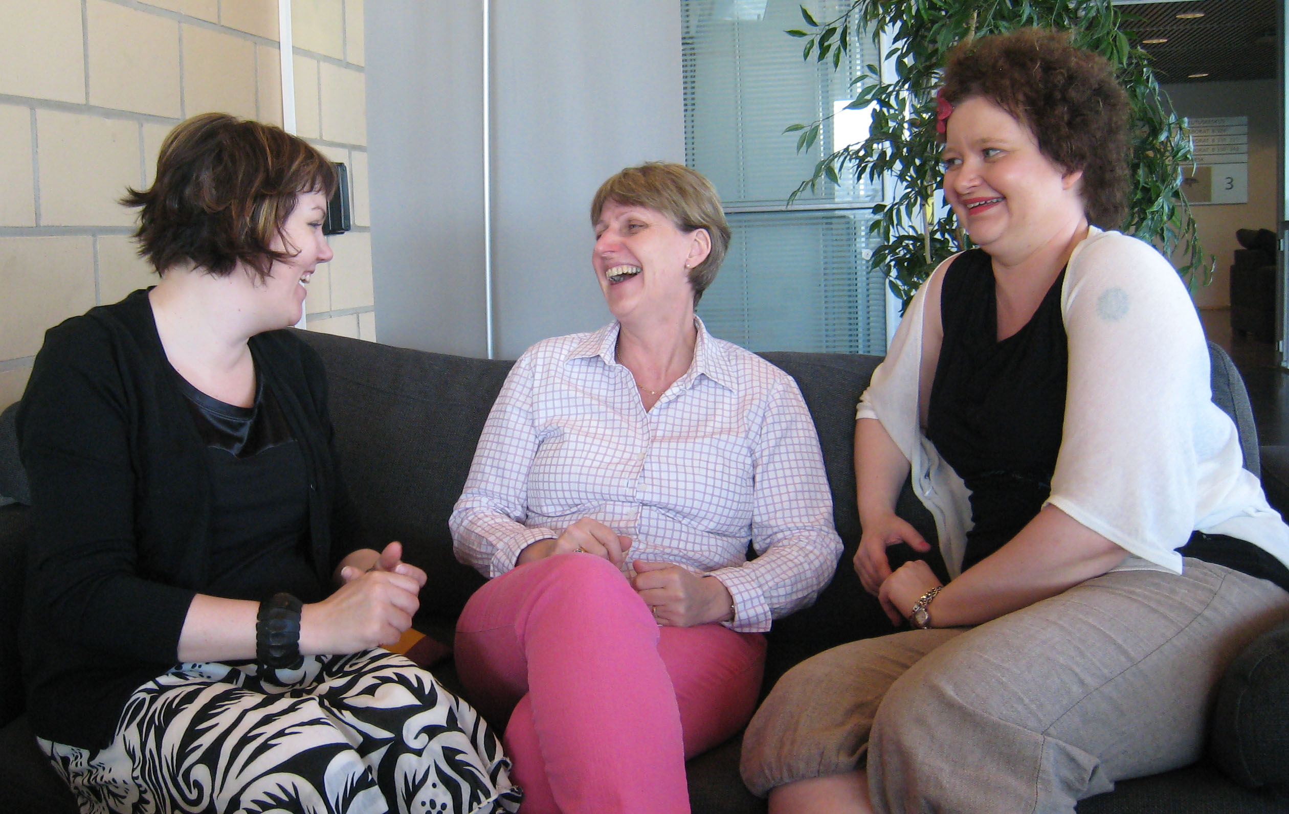 Minna Kaihovirta-Rapo, Elisabeth Schauman.ja Anne-Mari Raivio Myyrmäen kampuksen sohvalla.